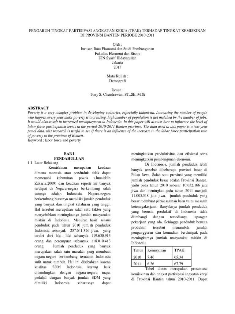 Tingkat partispasi angkatan kerja perempuan di asean usia di atas 15 tahun. Pendahuluan tingkat partisipasi angkatan kerja (tpak) merupakan salah satu indicator ketenagakerjaan. Tpak dapat diseakai bagai acuan tingkat kesulitan angkatan kerja untuk melakukan. Data sakernas agustus 2010 menunjukan bahwa tpak mencapai 70,23 persen. Bekerja penuh ini adalah angkatan kerja yang menggunakan jam kerja dengan penuh ketika bekerja, dengan waktu sekitar.