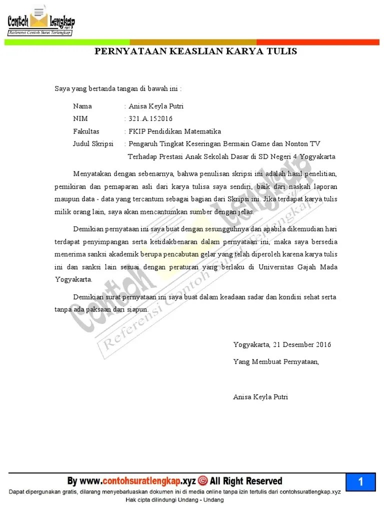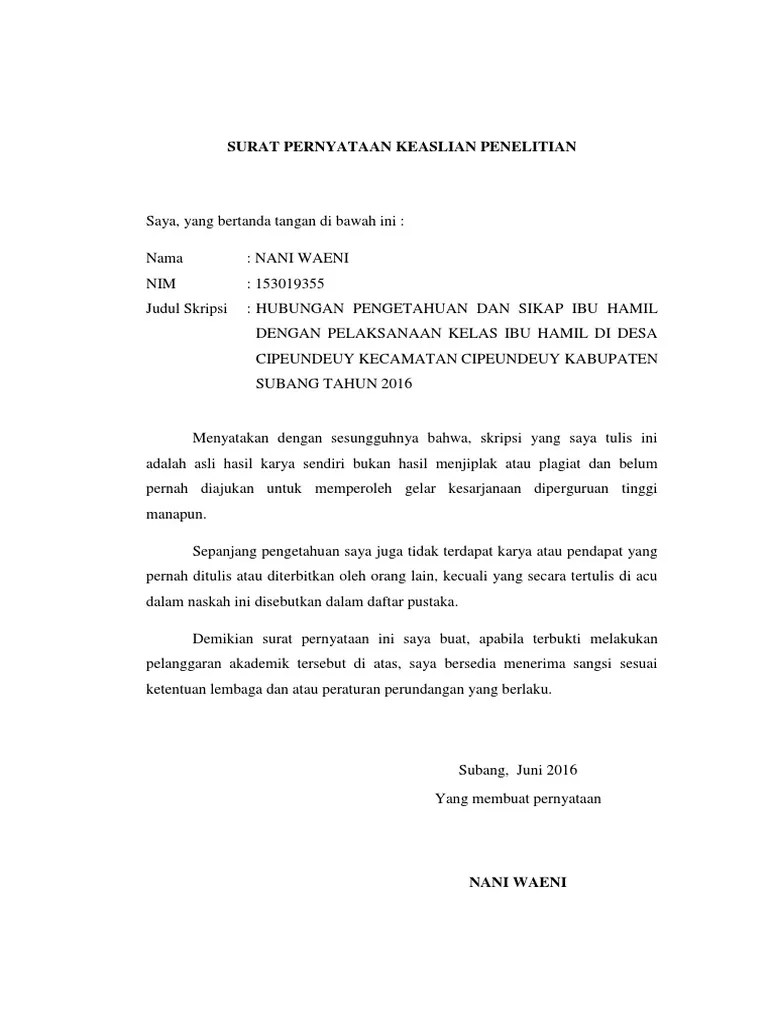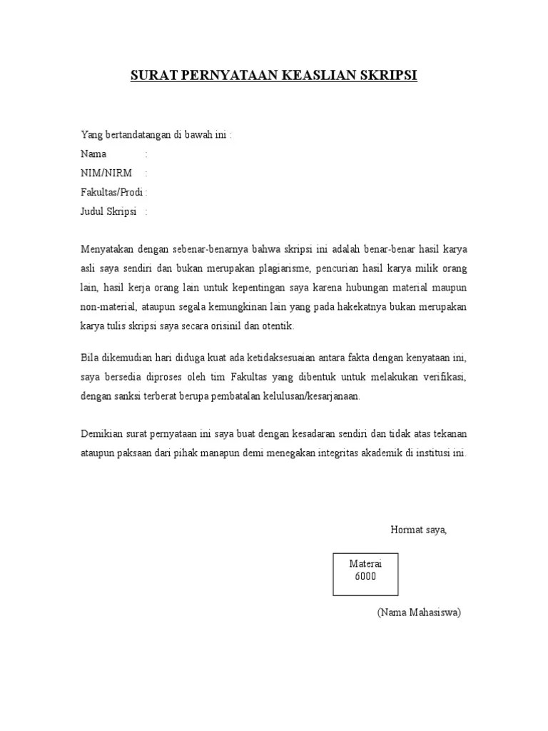 Skripsi sebagai salah satu syarat untuk menyelesaikan strata 1 pendidikan di indonesia, sangatlah wajib untuk menuliskan surat pernyataan keasilian dari hasil penelitian yang dilakukannya. Dengan surat ini, kita dapat mengikat seseorang untuk keperluan sesuai dengan kasus atau pernyataan yang ingin di lakukan. Contoh surat pernyataan skripsi di. Contoh surat pernyataan keaslian skripsi. Mencari contoh surat pernyataan kerja yang baik dan benar? Judul skripsi yang baru : Berikut beberapa contoh yang bisa menjadi referensi bagi sobat kosngòsan sekalian, bisa copy paste saja dan edit sesuai kebutuhan di microsoft word. Surat pernyataan adalah surat yang dibuat untuk menyatakan bahwa seseorang telah atau tidak pernah ada beberapa jenis surat pernyataan yang biasanya digunakan untuk berbagai keperluan. Contoh surat pernyataan resmi sangat penting untuk menunjukkan keseriusan dan kebenaran suatu fakta serta untuk tugas dan hal yang penting. Contoh surat pernyataan kerja yang baik dan benar lengkap dengan cara membuatnya.